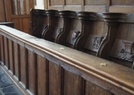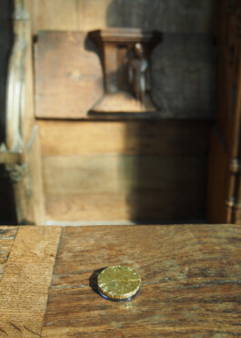 The Misericord, or mercy chair, is a small wooden chair attached to the underside of folding chairs in the church. They are placed there so that the choirs, who have to stand during the long masses, can sit down and rest in secret. The chocolate coins made as a small rest can be taken home by anyone who picks them up at the exhibition.