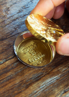 「慈悲の椅子」と呼ばれるミゼリコードは、教会の折りたたみ椅子の裏側にある小さな椅子です。この椅子は長いミサの間立っていなくてはならない聖歌隊がこっそりと腰掛け、休息を得るために置かれています。小さな休息として制作したチョコレートコインは、手にした人が展示会場から持って帰ることができます。