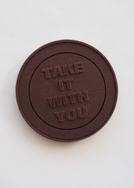 Take It With You —Slight Mercy—, 2015. Chocolate, acrylic mirror, aluminium foil. 4.5 × 4.5 × 1.0 cm. Wonder & Wander, Oude Kerk, Amsterdam, NL.